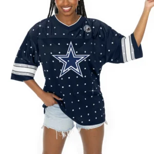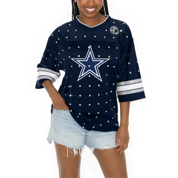 Dallas Cowboys Gameday Couture Women’s Kickoff Time Allover Rhinestone Sports Stripe Jersey V-Neck T-Shirt – Navy
